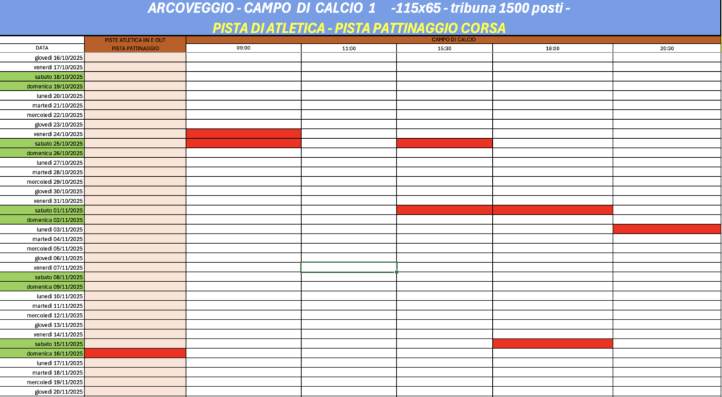 Si segnala che l’uso della pista d’atletica outdoor è vincolato al calendario delle partite di calcio, agli usi scolastici e alle iniziative in programma.